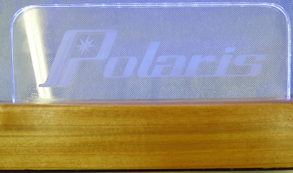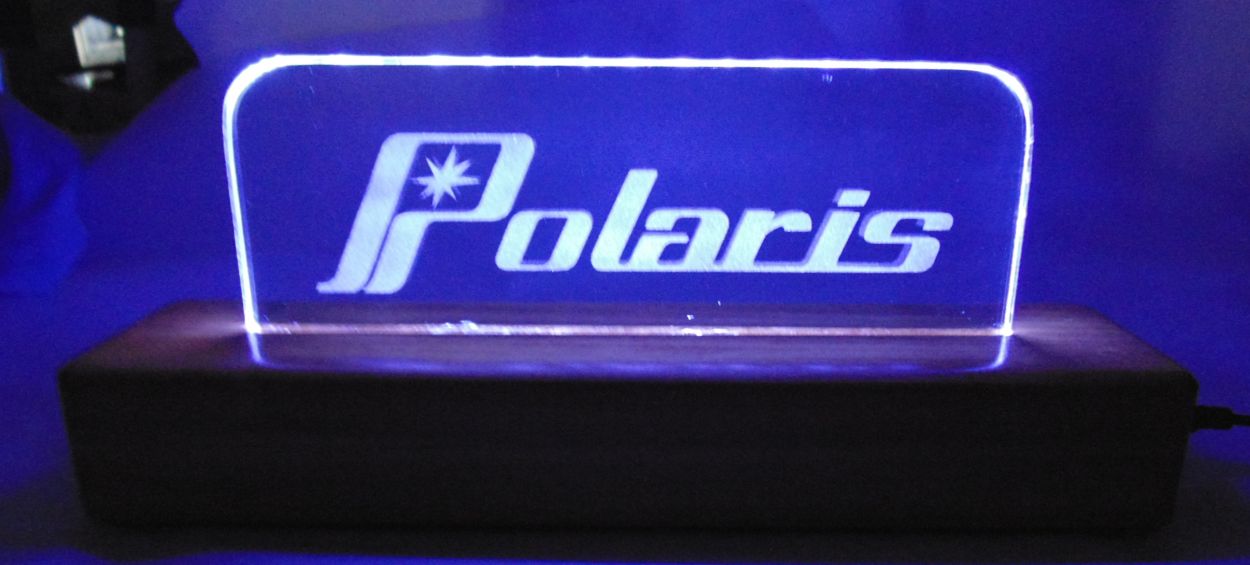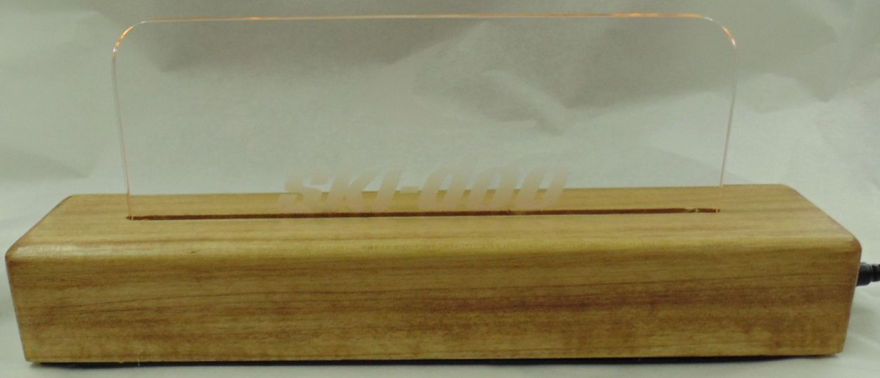 Technical data. Powered by 120 volt LED power supply. Sign portion is 1/4 inch Plastic, hand polished edges, and engraved with your favorite Snowmobile Logo! The plastic portion of the sign is about 3 inches by 8 inches for most applications. Some may differ slightly. The base is about 11 inches wide, made of hardwood.