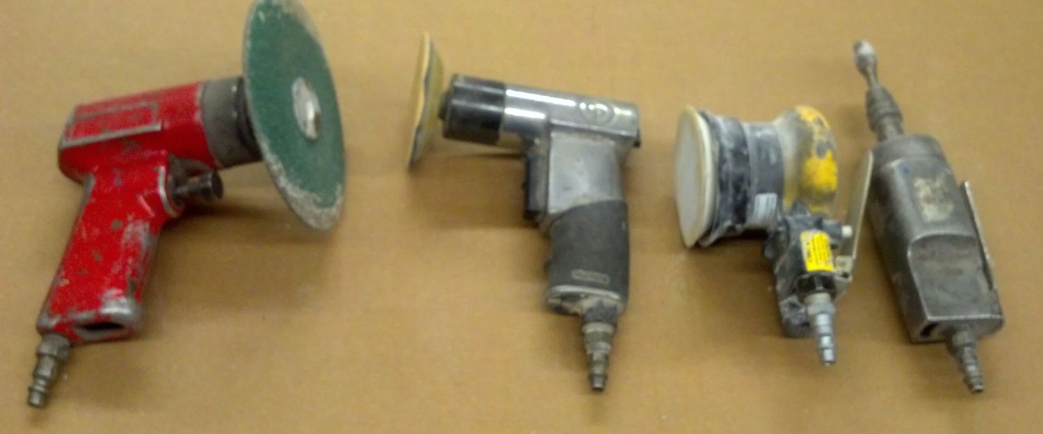 5 inch grinder, 3 inch sander, 3 inch DA sander, and die grinder. |